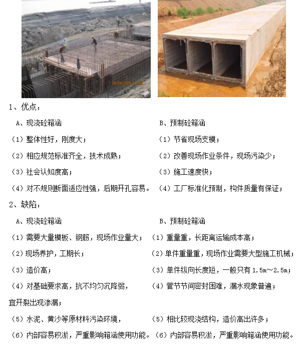 由鋼筋混凝土或圬工材料制成箱形管節(jié)的涵洞,可用來輸水、排水、蓄水、行洪,過人及車輛通過。箱涵施工一般采用現(xiàn)澆,也有部分采用預制砼。其優(yōu)缺點如下: